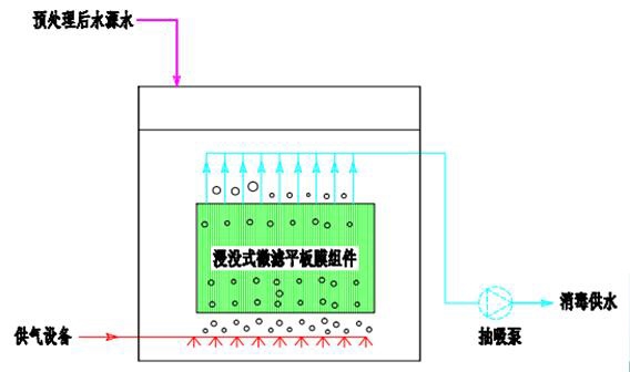 以浸没式平板膜作为原水过滤单元,截留原水中����� �������Ƴ������������ �������Ƴ������������ �������Ƴ������������ �������Ƴ�������悬浮物和细菌,达到净化水质的目的。